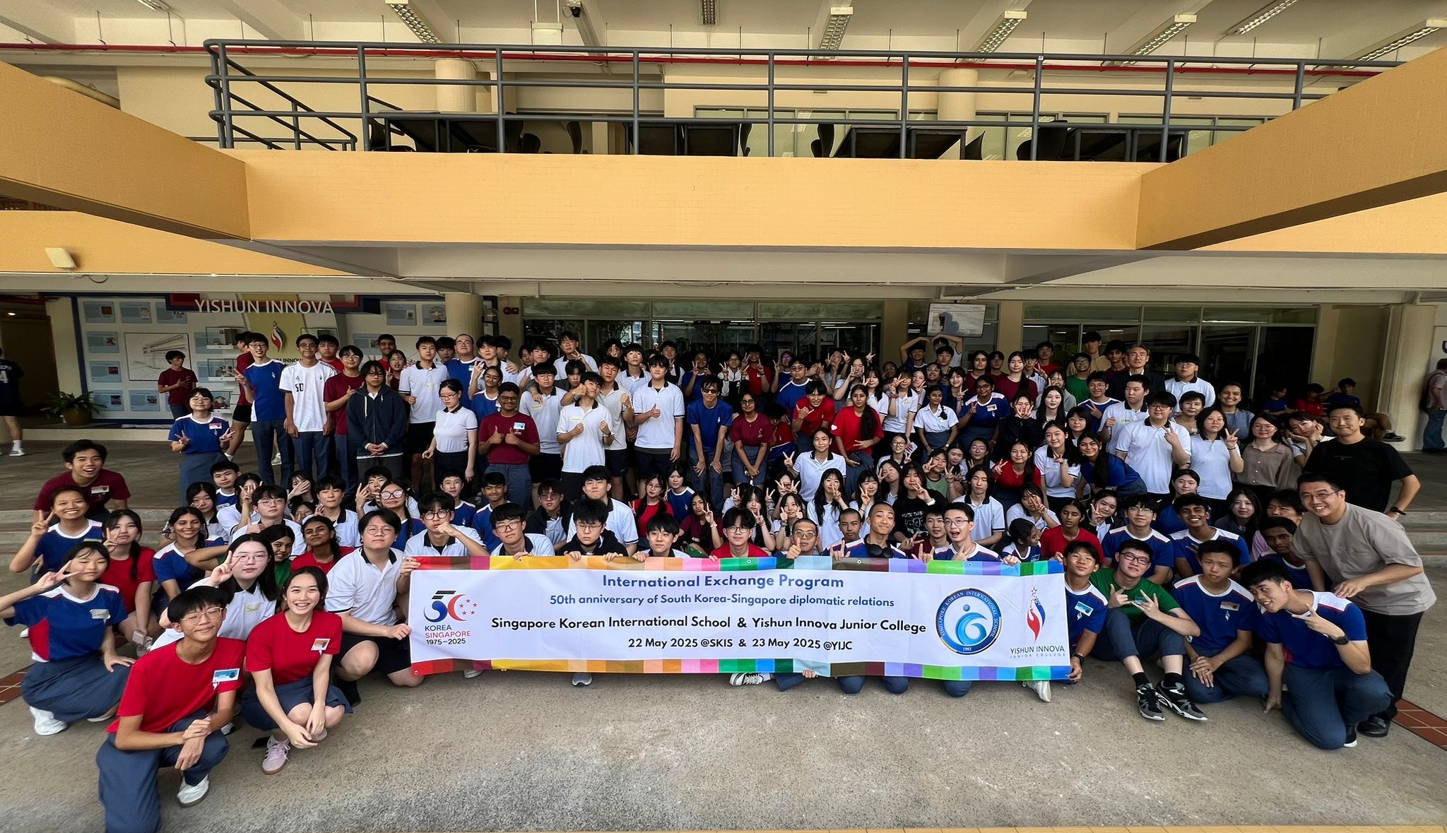 22 and 23 May 2025 marks the first high school exchange between Singapore Korean International School (SKIS) and Yishun Innova Junior College (YIJC). Our Grade 10 to 12 students were good cultural ambassadors by participating alongside with our guests in various activities including Korean calligraphy, Korean childhood games, K-pop random dance, and the making of hwachae (fruit punch) and injeolmi (rice cake with soy bean powder), the latter being the most popular programme among students. To commemorate the 50th anniversary of diplomatic relations between South Korea and Singapore, SKIS and YIJC students gave an insightful presentation on the intangible cultural heritage of both countries. Our students also got to experience junior college life by attending lessons ranging from PE to Tamil Language. The 2-day high school exchange provided an important platform for SKIS high students to have a glimpse of each other's education system and cultural tapestry.