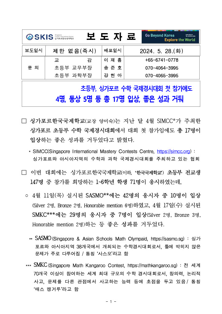 Á¦¸ñ ½Ì°¡Æ÷¸£Çѱ¹±¹Á¦Çб³ ÃʵîºÎ, ½Ì°¡Æ÷¸£ ¼öÇÐ ±¹Á¦°æ½Ã´ëȸ ù Âü°¡¿¡ ÁÁÀº ¼ºÀû °ÅµÖ